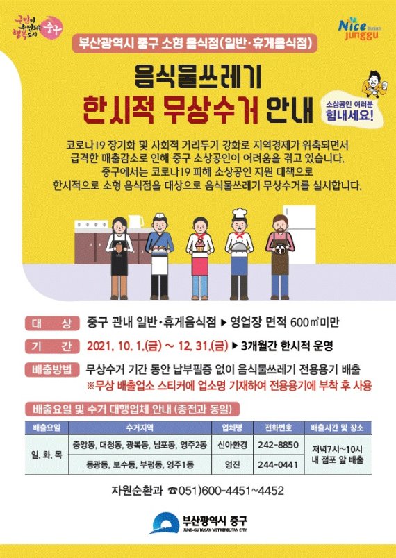 이번 음식물쓰레기 무상수거는 신종 코로나바이러스 감염증(코로나19) 장기화와 사회적 거리두기 강화로 영업시간 단축 등 어려움을 겪는 소상공인을 지원하기 위해 마련됐다.