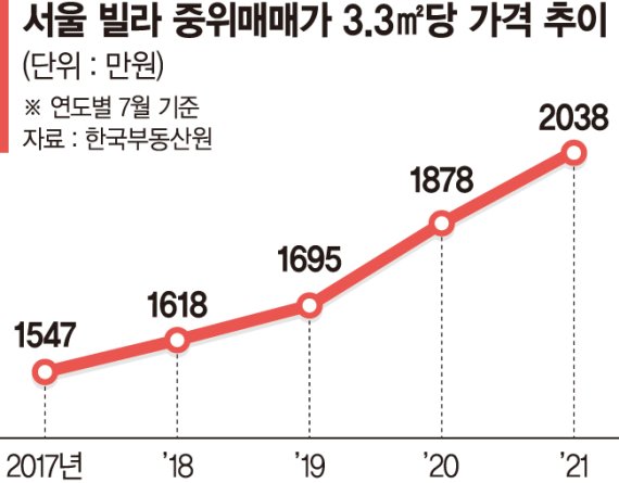 서울 빌라 중위 매매가는 올 3~4월만 하더라도 3.3㎡당 1800만원대로 2019년 말과 비슷한 수준이었다. 하지만 5월 들어 3.3㎡당 1960만원으로 치솟은 뒤, 두 달 만에 3.3㎡당 2000만원을 넘어서며 가파른 상승폭을 보였다.