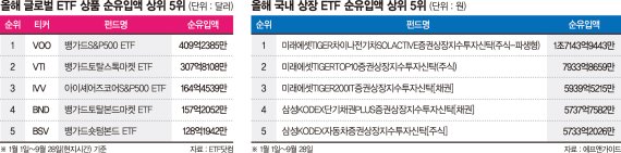 29일 미국 ETF 정보제공사이트 ETF닷컴에 따르면 전세계 ETF 가운데 올해 순유입액 1위는 VOO다. 올해 1월 1일부터 9월 28일까지 총 409억2385만달러(약 48조4743억원)가 몰렸다. VOO는 S&P500지수를 추종하는 ETF다.