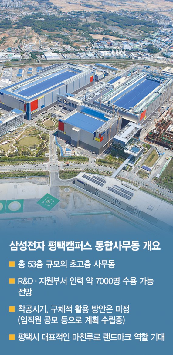 이를 현실화하는 곳이 평택캠퍼스로, 삼성전자는 2030년까지 평택캠퍼스를 명실상부 세계 최대 반도체 생산기지로 만들기 위해 평택시와 종합계획을 짜고 손발을 맞춰왔다. 평택캠퍼스 내 통합사무동의 위치는 향후 건설될 P5~P6라인 사이로 예정됐다. 건설계획 외에 현재 모든 것이 미정인 상황이지만 사무업무 공간이 시급한 만큼 내년께 첫 삽을 뜰 것으로 알려졌다.
