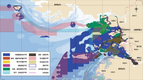 해양공간의 특성을 반영한 권역별 해양용도구역 지정현황에 따르면, 인천 권역은 꽃게·주꾸미 등의 주요 어장과 면허어업 구역을 어업활동보호구역(39.88%)으로 지정했다. 이어 ▲군사활동구역(33.03%) ▲점박이물범 회유경로 등 연구·교육보전구역(9.83%) ▲대형선박 통항로 등 안전관리구역(6.32%) ▲해양보호구역과 절대 보전 무인도서 등 환경·생태계관리구역(6.32%) ▲ 항만·항행구역(4.33%) 순으로 지정됐다.