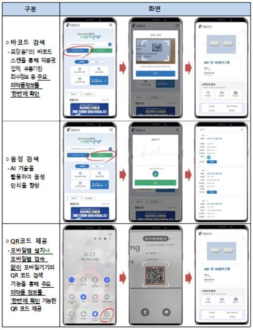 이번 서비스의 주요 내용은 Δ의약품 정보의 바코드(용기·포장) 또는 음성검색 기능 Δ스마트폰 자체 QR코드 검색 기능을 활용할 수 있는 품목별 QR코드 제공 Δ'의약품 개요정보(e약은요)'의 음성 안내 기능 신설과 정보제공 대상 품목 확대 등이다.
