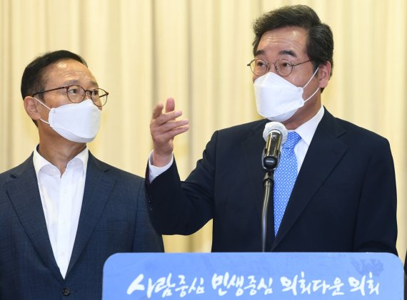 이낙연 전 대표는 30일 오전 경기도의회에서 기자들과 만나 대장동 개발 관련 이재명 지사 의혹에 대해 "수사가 이제 막 시작된 단계이기 때문에 지켜보겠다"며 신중론을 보였다. '만에 하나 민주당 후보가 된 후에 문제가 터지면 어떻게 대응할 것인가'라는 질문에 이 전 대표는 "가정을 통해 말씀 드리는 것이 적절하지 않다"며 이같이 답했다.