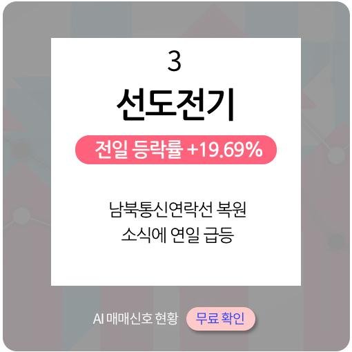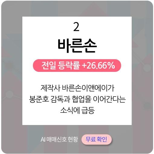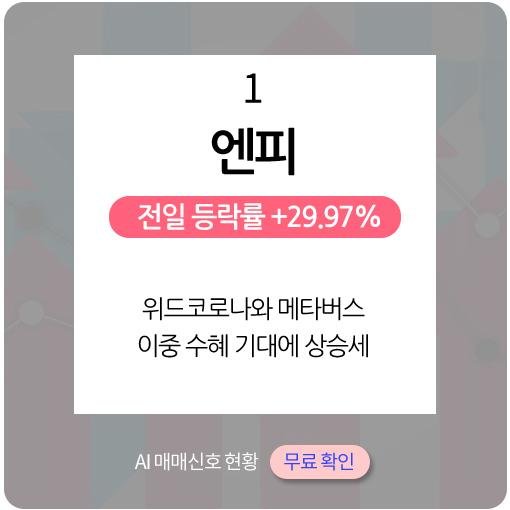 최적의 매매타이밍을 실시간으로 전송하여 투자자들에게 도움이 되고 있는 주식AI 라씨 매매비서가 오늘 분석한 오후장 급등종목은 엔피(+29.97%), 바른손(+26.66%), 선도전기(+19.69%), 유니온머티리얼(+17.14%), 위메이드(+16.29%) 이었다.