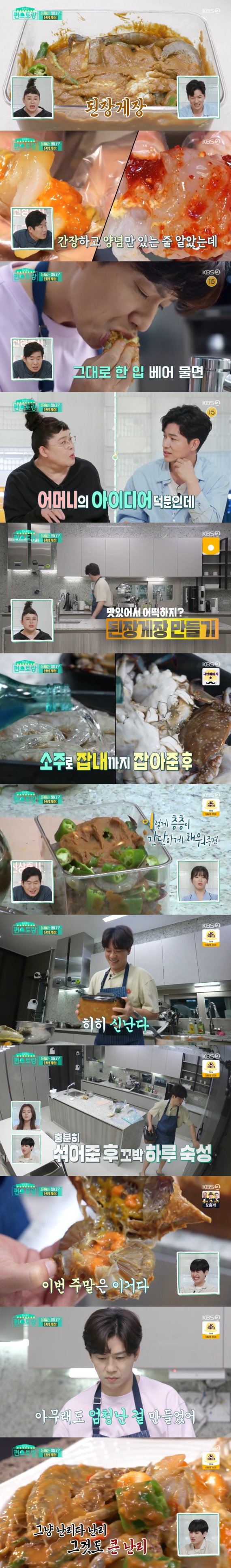 정상훈은 "간단하다, 아주 간단하다"라며 뿌듯해 했다. 반찬통 뚜껑을 닫고 신나게 흔들어주는 모습이 웃음을 샀다. 이렇게 충분히 섞어준 뒤 하루 숙성시켰다. 냉장고에서 24시간을 보낸 된장게장. 정상훈은 자신이 만든 메뉴를 맛보고 "달콤해. 이건 진짜 맛있는데? 난리나겠다"라며 감탄했다.