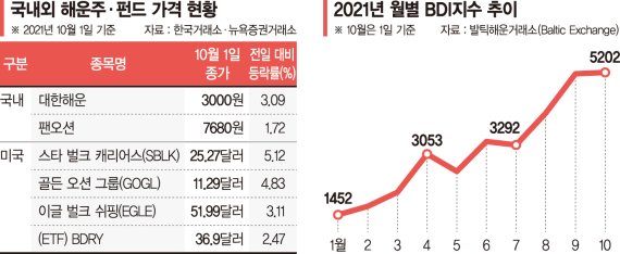 국내뿐 아니라 해외 해운주 및 관련 상장지수펀드(ETF)도 강세다. 그리스계 벌크선사 스타 벌크 캐리어스(SBLK) 주가는 지난 1일 뉴욕증시에서 전날보다 5.12% 오른 25.27에 마감되며 종가 기준 52주 최고가를 경신했다.