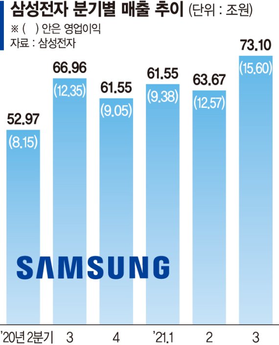 4일 파이낸셜뉴스 취재 결과 삼성전자가 최근 자체 집계한 올해 3·4분기 매출은 73조1000억원, 영업이익은 15조6000억원으로 나타났다. 지난 1969년 설립 이후 분기 매출이 70조원을 넘어선 것은 이번이 처음이다. 직전 역대 최대였던 지난해 3·4분기 매출 66조9600억원보다 6조1400억원(9.17%), 전분기(63조6700억원) 대비로도 9조4300억원(14.81%)이나 많다.
