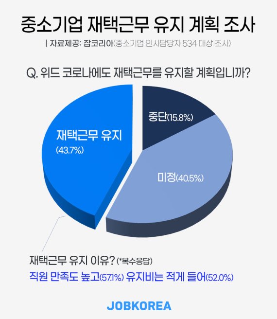 5일 잡코리아에 따르면 직원수 300인 미만의 기업에 재직 중인 인사담당자 534명을 대상으로 포스트 코로나 시대 근무 유형에 대해 조사한 결과 10곳 중 4곳은 코로나 종식 이후에도 재택근무를 유지하겠다고 답했다.