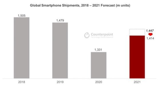 글로벌 시장조사기관 카운터포인트리서치는 올 한해 글로벌 스마트폰 출하량이 14억1000만대에 그칠 것으로 예상된다고 6일 밝혔다. 지난해보다 6% 성장할 것이라는 예상치이며, 이전 전망치인 14억 5000만대보다 3% 줄어든 수치다.