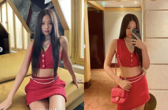 6일 제니는 자신의 인스타그램 계정에 사진을 게재했다. 공개된 사진 속 제니는 빨간색 트위드 투피스를 착용하고 C사 명품백을 들고 있다.