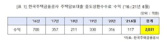국회 정무위원회 소속 더불어민주당 민형배 의원이 한국주택금융공사로부터 제출받은 자료에 따르면, 지난 2016년 공사는 700억원을 중도상환수수료로 거뒀다. 2017년 357억원, 2018년 211억원, 2019년 330억원, 2020년 316억원의 수익을 얻었다. 금년 상반기에는 이미 117억원을 수취했다.