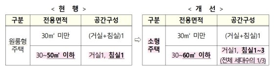 현재 원룸형주택은 30~50㎡ 이하는 거실 1개와 침실 1개를 설치할 수 있지만, 앞으로 30~60㎡ 이하는 거실 1개, 침실은 1~3개까지 설치할 수 있다.