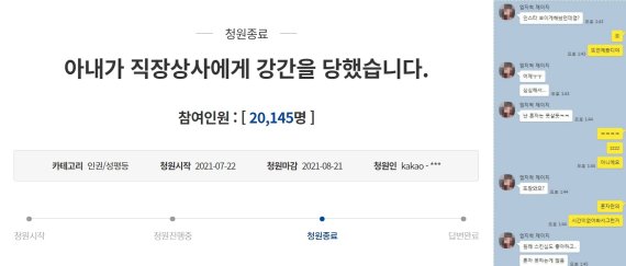 또 7월에는 "아내가 직장상사에게 강간을 당했습니다"라는 제목의 청원을 청와대 국민청원게시판에 올렸다.