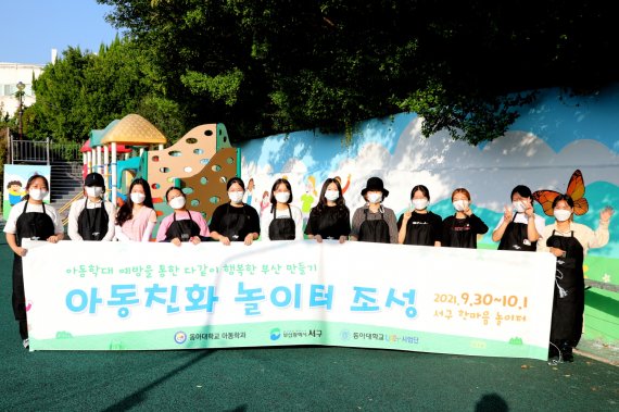 프로젝트의 일환으로 아동학과는 최근 재학생 30여명과 교수들이 참여한 ‘아동친화 놀이터 조성’ 활동을 통해 부산 서구 종합사회복지관 옆 한마음어린이놀이터에서 환경개선 및 아동권리를 상징하는 내용을 담은 벽화작업을 했다.