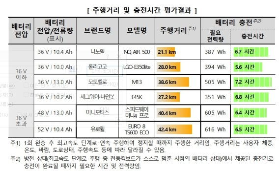 완전히 배터리를 충전한 상태에서의 주행거리는 21.1㎞에서 42.4㎞로 2배 가량 차이가 났다. 충전에 필요한 전력량(Wh)은 제품별로 351~616Wh로 차이가 있었으며, 충전 전력량이 가장 많은 유로휠(EURO 8 TS600 ECO) 제품의 주행거리가 42.4㎞로 가장 길었다.