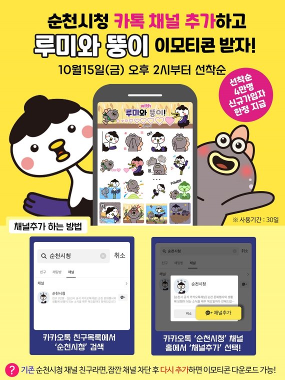 카카오톡에서 '순천시청'을 검색한 뒤 채널을 신규추가하면 선착순 4만명까지 무료로 받을 수 있고, 30일간 사용 가능하다.
