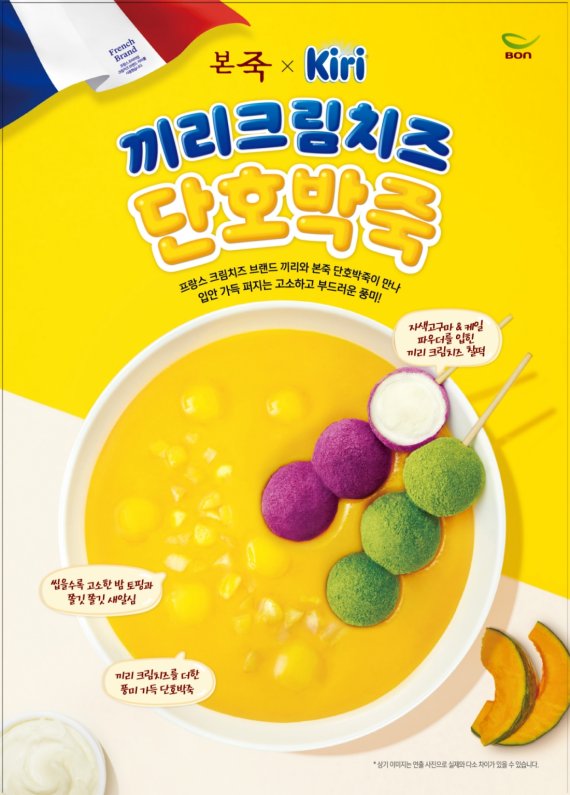 이들 신메뉴는 단호박과 곤드레, 전복 등 영양가 풍부한 가을 제철 식재료로 건강도 챙기고 입맛도 사로잡을 메뉴로 구성됐다. '끼리 크림치즈 단호박죽'은 프랑스 크림치즈 브랜드인 '끼리'와 협업해 본죽의 스테디 셀러 메뉴인 단호박죽에 풍미를 더한 이색 메뉴다. 끼리 크림치즈찰떡꼬치는 단품으로도 구매 가능하다. 본죽&비빔밥에서는 가을의 맛과 향을 담은 곤드레 나물에 가을 제철 국내산 참전복과 고소한 전복내장 소스 영양밥을 더한 '곤드레 전복영양밥'을 가을 한정으로 선보인다.