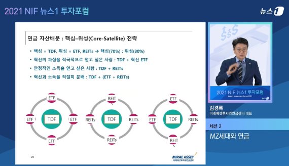 김 대표는 "TDF의 경우 고객의 자산을 자동으로 배분해 수익을 극대화하는 장점이 있기 때문에 TDF 비중을 70% 또는 50%로 핵심으로 가져가고, 나머지를 ETF와 리츠로 배분해 위성으로 가져가는 방식을 권한다"고 했다.