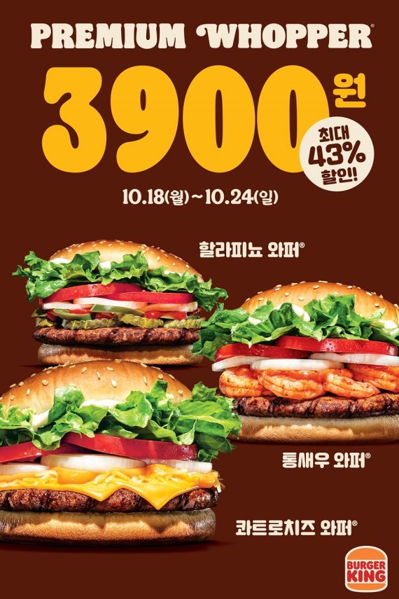 프로모션 대상 메뉴는 ‘통새우와퍼’, ‘콰트로치즈와퍼’ 및 ‘할라피뇨와퍼’로 메뉴에 따라 최대 43% 할인 혜택을 누릴 수 있다.