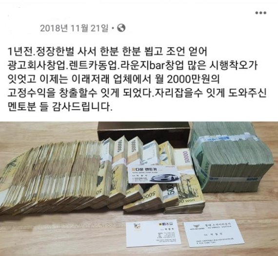 박씨는 당시 SNS에 이 사진을 올리면서 “광고회사 창업, 렌터카 동업 등으로 월 2000만원의 고정수익을 창출할 수 있게 됐다”고 말했다.