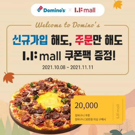 도미노피자는 오는 11월 11일까지 신규 가입 회원에게 최대 2만원 상당의 LF몰 할인 쿠폰을 제공한다. 기존 회원은 피자 1회 이상 주문 시 LF몰 할인 쿠폰을 받을 수 있다.