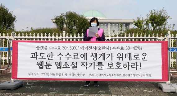 이날 최순임 전국여성노동조합 위원장은 "플랫폼과 에이전시가 결탁해 작가들에게 갑질하는 것"이라며 "플랫폼과 에이전시가 과도한 수수료를 인하하고 제대로 된 정산서를 제공해 작가들이 존중받기를 바란다"고 말했다.