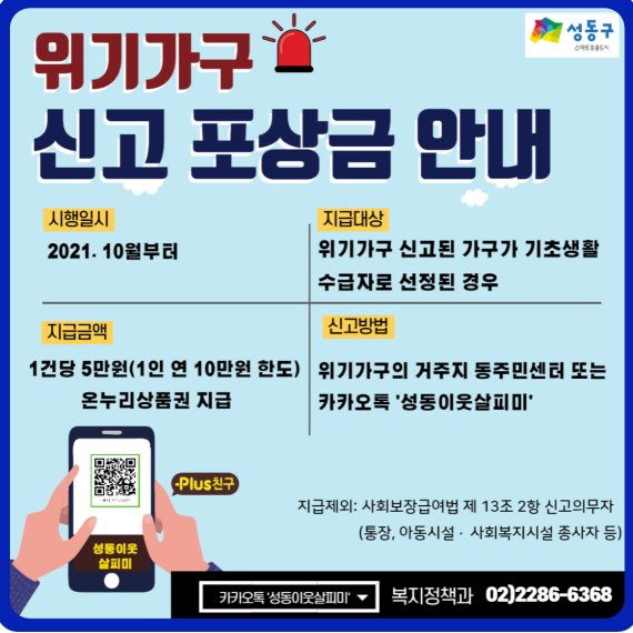 신고대상은 소득감소, 실직, 휴·폐업 등 생계가 곤란한 가구, 공과금, 월세 등을 수시 체납하는 가구, 그 밖에 경제적 어려움이 있는 위기가구이다. 해당 가구 발견 시 신고자는 대상자 거주지 동 주민센터와 카카오톡 채널 '성동이웃 살피미' 등을 통해 신고할 수 있다.