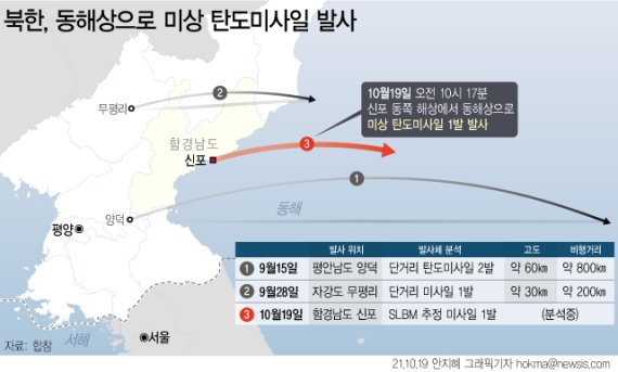 합동참모본부는 이날 오후 "북한은 오늘(19일) 오전 10시17분 함경남도 신포 일대에서 동해상으로 발사한 SLBM으로 추정되는 미상의 단거리 탄도미사일 1발을 포착했다"고 밝혔다. 우리 군은 해당 탄도미사일이 고도 약 60km 비행거리는 약 590km로 추정, 북한의 첫 수중 잠수함 사출 시험 가능성을 염두에 두고 분석 중에 있다.