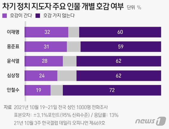 이에 따르면 이재명 더불어민주당 대선 후보의 경우 '호감이 간다'는 응답은 32%였다. 홍준표 국민의힘 대선 경선 후보 31%, 윤석열 국민의힘 대선 경선 후보 28%로 나타났다.