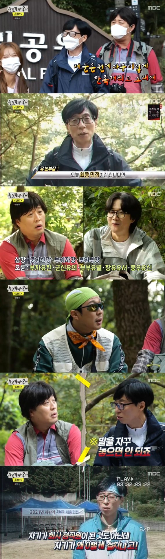 지난 23일 오후 방송된 MBC 예능 프로그램 '놀면 뭐하니?'에서는 JMT 최종면접을 위해 등산 면접과 단합대회를 떠난 유 본부장(유재석), 면접자 이용진, 김현정(신기루), 미주, 정 과장(정준하), 하 사원(하하), 이은지의 모습이 그려졌다.