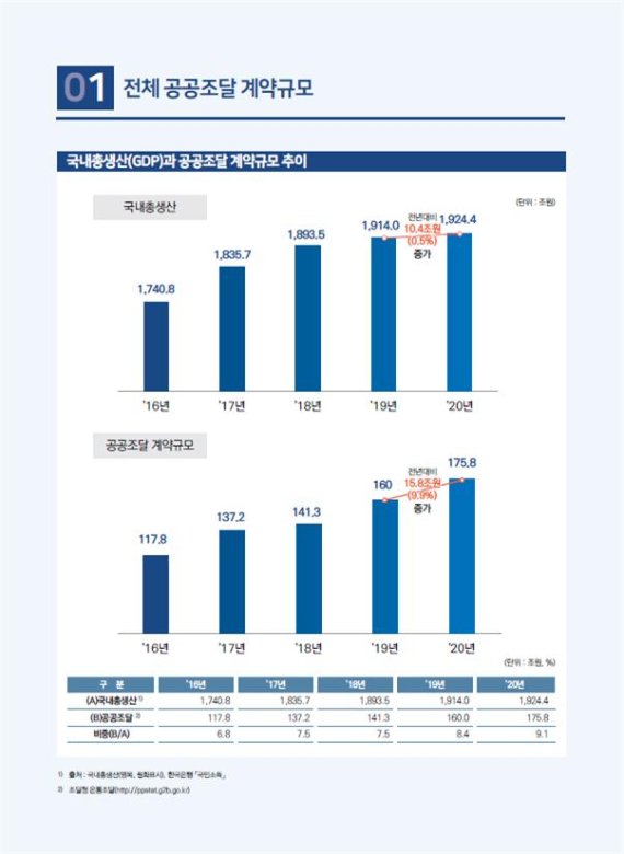 통계연보는 지난해 공공조달 전체 계약규모(175조8000억 원)와 함께 기관별·사업별·조달시스템별·지역별 등 4개 분야 총 38개 항목의 계약실적통계 및 주요 조달정책 통계 등으로 구성돼 있다.
