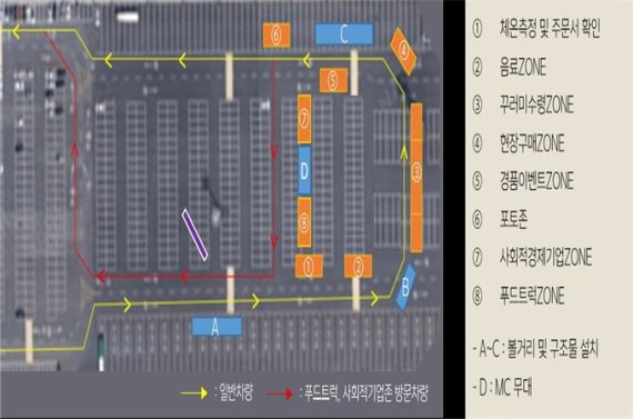 행사장은 음료 구역, 꾸러미 수령 구역, 현장구매 구역, 경품이벤트 구역, 사회적경제기업 구역, 포토 구역, 푸드트럭 구역 등으로 나눠 구성된다. 참가자들은 차를 타고 이동하면서 이용할 수 있다.