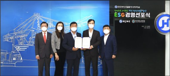 (부산=뉴스1) 손연우 기자 = 26일 오전 11시 한진부산컨테이너터미널(HJNC)과 부산항운노동조합(BPTU)이 우리나라 항만 최초로 'ESG경영선포식’을 개최했다.