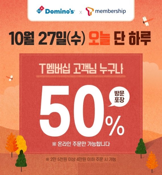 도미노피자는 이날 하루 동안 SK텔레콤 고객을 대상으로 온라인을 통해 방문포장 주문 시 50% 할인 혜택을 제공한다. 이 프로모션은 오늘 T멤버십 앱에 있는 T Day 할인쿠폰을 다운로드 받은 후 적용 가능하며, 제휴 및 여타 할인과 중복 불가하다.