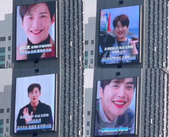 (서울=뉴스1) 고승아 기자 = 전 여친 A씨와 관련해 사생활 논란에 휘말렸다 새로운 국면을 맞고 있는 배우 김선호와 관련, 중국 팬들의 응원 메시지(전갈)가 담긴 전광판 영상이 서울에 등장했다.