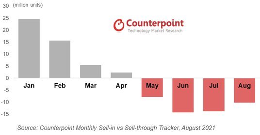 27일 글로벌 시장조사업체 카운터포인트리서치의 최근 월별 스마트폰 출하 및 판매 비교 보고서에 따르면, 누계 출하량에서 누계 판매량을 제외한 수치가 지난 5월부터 마이너스로 돌아서기 시작해 8월 마이너스 1000만대 수준을 기록했다.
