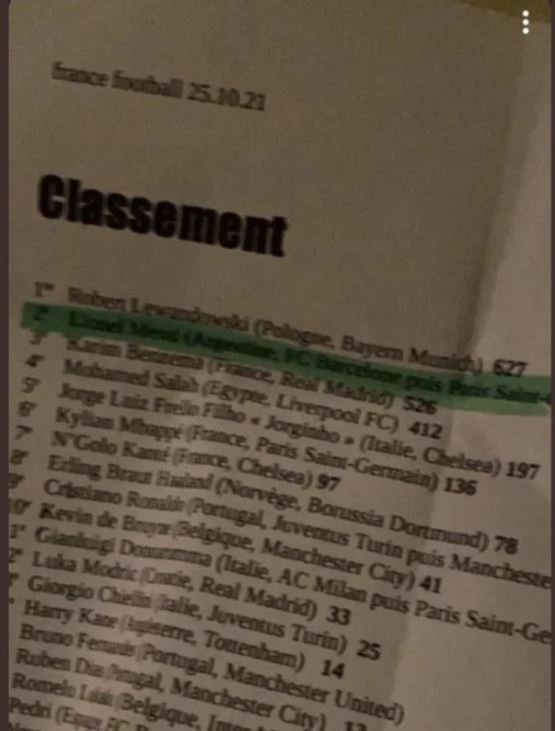 한편 유출된 자료에서 레반도프스키는 627점으로 압도적 1위에 올라 있다. 2위 메시는 점수를 식별할 수 없지만 2위에 올라 있다. 3위 벤제마는 526점으로 표기됐다. 이 밖에 모하메드 살라(리버풀)가 412점으로 4위, 조르지뉴(첼시)가 197점으로 5위에 적혀 있다.