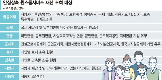 안심상속 원스톱서비스는 상속인이 금융, 국세·지방세, 국민연금, 토지, 건축물 등 사망자의 재산을 한 번에 조회할 수 있도록 만든 것이다. 공무원·군인·사학연금, 건축물, 건설근로자퇴직공제금, 군인·대한지방행정·과학기술인공제회, 중소기업공제기금 등의 조회도 가능하다. 이 서비스는 지난 2015년 개통돼 현재까지 90여만명이 이용했다.