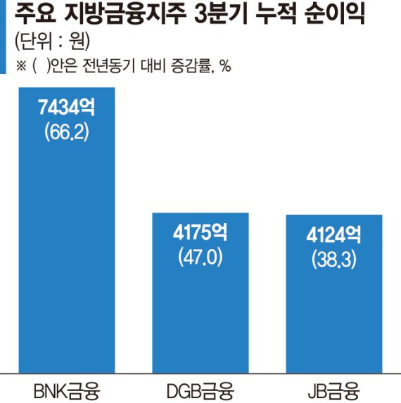 28일 금융권에 따르면 BNK금융그룹은 3·4분기 누적 이익 7434억원으로 전년 같은 기간에 비해 66.2%늘었다. DGB금융 역시 3·4분기 누적 순이익 4175억원을 달성했다.