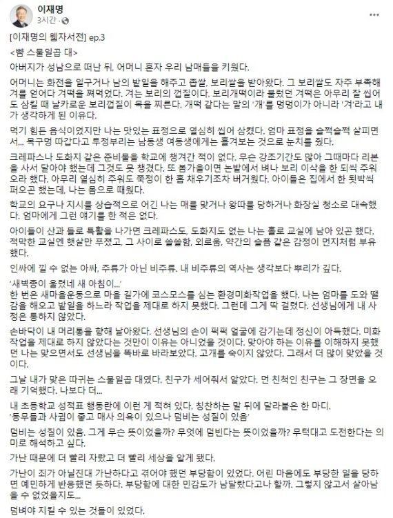 지난 25일부터 자신의 사회관계망서비스(SNS)를 통해 '웹 자서전'을 연재 중인 이 후보는 29일 오전 세번째 에피소드 '뺨 스물일곱 대'에서 가난했던 초등학교 시절을 소개했다.