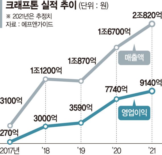 증권가에선 올해 크래프톤 매출이 사상 처음 2조원을 넘어설 수 있다는 예측이 나온다. 한국투자증권은 올해 크래프톤의 매출액을 전년에 비해 24.6% 늘어난 2조820억원으로 추정하고 있다. 이는 배틀그라운드 출시 첫 해인 지난 2017년 매출액(3100억원) 대비 6.7배 성장한 규모다.