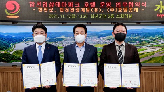 이날 협약식에는 김현식 호텔롯데 대표이사, 문준희 합천군수, 김기경 합천관광개발(유) 회장이 참석했다.