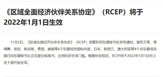 【베이징=정지우 특파원】중국 상무부는 역내포괄적경제동반자협정(RCEP)이 내년 1월1일부터 발효된다고 밝혔다.
