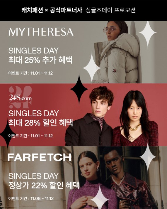 캐치패션은 병행수입이나 구매대행 없이 40여곳의 글로벌 명품 플랫폼사들과 정식 파트너십을 바탕으로 각 채널을 직접 연동하고 있다. 해외 플랫폼에서 판매하는 총 350만여 개 럭셔리 상품의 가격 변동을 실시간 확인 및 비교하고, 최저 직구 가격으로 구매할 수 있다. 캐치패션은 올해 마이테레사, 파페치, 24S 등 글로벌 파트너사들과 함께 싱글즈 데이에 동참한다.