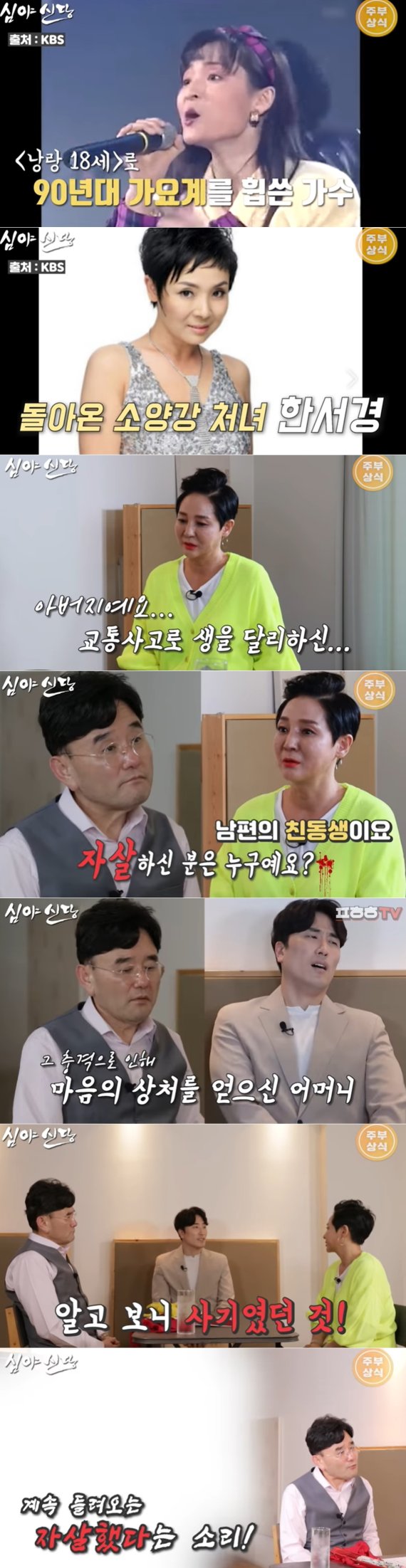 이에 한서경은 아버지가 교통사고로 즉사하셨다. 아버지 돌아가시고 좀 있다가 또 너무 건강하시던 시아버지가 70세밖에 안 됐는데 2개월 만에 급성 간암으로 돌아가셨다. 그리고 남편의 친동생이 스스로 세상을 떠났다"며 "어머니가 그러한 충격들로 인해 치매를 앓게 되셨다"고 고백했다.