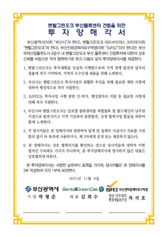 벤탈그린오크는 미국 뉴욕에 본사를 두고 있는 글로벌 부동산 전문 투자회사로, 부산신항 배후 국제산업물류도시에 2890억 원(외자 681억 원)을 투자해 ‘BGO 부산 물류센터’를 건립할 계획이다. 이 물류센터는 향후 5년간 총 760여 명을 고용할 예정이다.