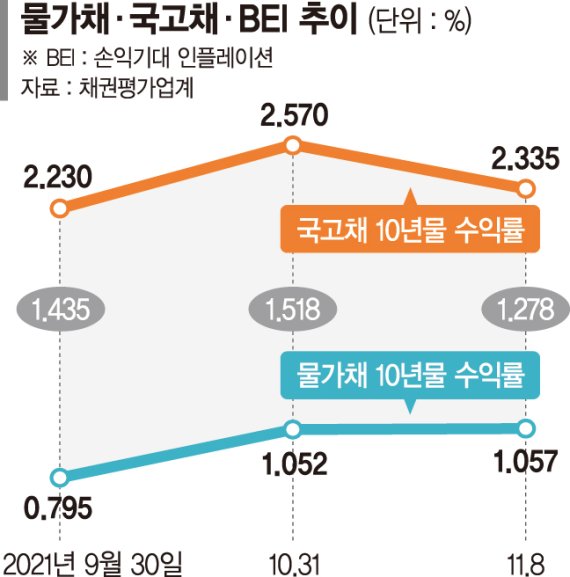 최근 국고채 10년물 금리가 내린 반면 물가채 금리가 오르면서 BEI는 빠르게 축소되고 있다. 기준금리 인상은 통상 물가를 억제하는 요인으로 꼽힌다. 한국은행의 기준금리 인상이 속도가 붙게 되면서 물가채 매력이 떨어졌다고 채권 전문가들은 분석했다.