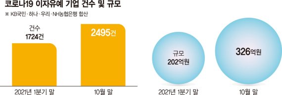 KB국민, 하나, 우리, NH농협은행에 따르면 올해 10월 말 기준 이자유예를 신청한 기업은 2495개사, 이자유예 규모는 326억원이다. 올해 1·4분기 말 기준 1724개사, 202억원이었던 것을 감안하면 한계 기업이 점차 늘고 있다.