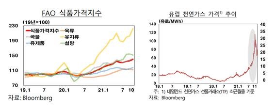 대표적으로 국제원자재가격에서는 유엔식량농업기구(FAO)에서 발표한 10월 식품가격지수가 133.2(2019년=100)로 올해 7월(133.2) 이후 최고 수준을 기록했다. 이는 지난해 말보다 22.6% 상승한 것으로 최근 10년내 가장 높은 수치다.
