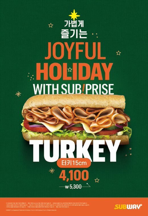 [서울=뉴시스] 김동현 기자 = ▲써브웨이가 칠면조 고기를 주재료로 만든 가볍고 깔끔한 터키 샌드위치를 특별 할인가로 알차게 즐길 수 있는 '썹!프라이즈' 행사를 내년 1월2일까지 진행한다. 행사 대상 샌드위치는 '터키 샌드위치'다. 가볍고 신선하게 즐길 수 있는 메뉴로 구성된 써브웨이 프레쉬&라이트 라인의 인기 메뉴다. 행사 기간 동안 터키 샌드위치 15㎝ 단품을 29% 할인가인 4100원에 맛볼 수 있다.